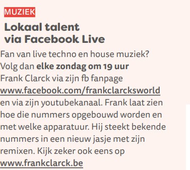Deze maand kan u mij ook terugvinden in het stadsmagazine van Lommel onder lokaal talent. Dank u wel dienst cultuur om me al voor de 2 maal zo uitgebreid in de kijker te zetten. Deze extra aandacht is een serieus hart onder de riem in deze moeilijke tijden voor de evenementensector. Voor iedereen die toch iets meer over me wil te weten komen dan deze sumiere beschrijving verwijs ik door naar de bio en alle artikels hier op de website. Frank Clarcks World komt binnenkort terug maar nu light de aandacht even op nieuwe producties.